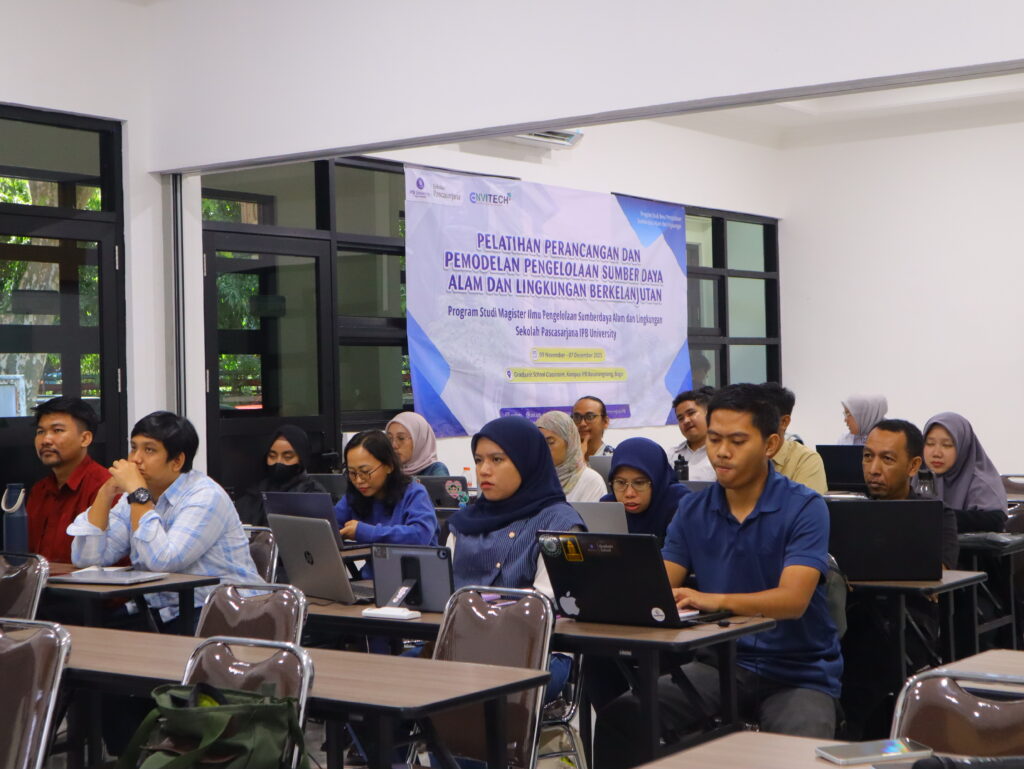Setelah kegiatan Pelatihan Perancangan dan Pemodelan Pengelolaan Sumber Daya Alam dan Lingkungan Berkelanjutan Program Magister PSL IPB resmi dibuka, para peserta memulai sesi pelatihan hari pertama, Minggu, 9 November 2025. Pelatihan yang diikuti oleh 23 peserta ini menghadirkan tiga narasumber yang memaparkan dua topik utama.