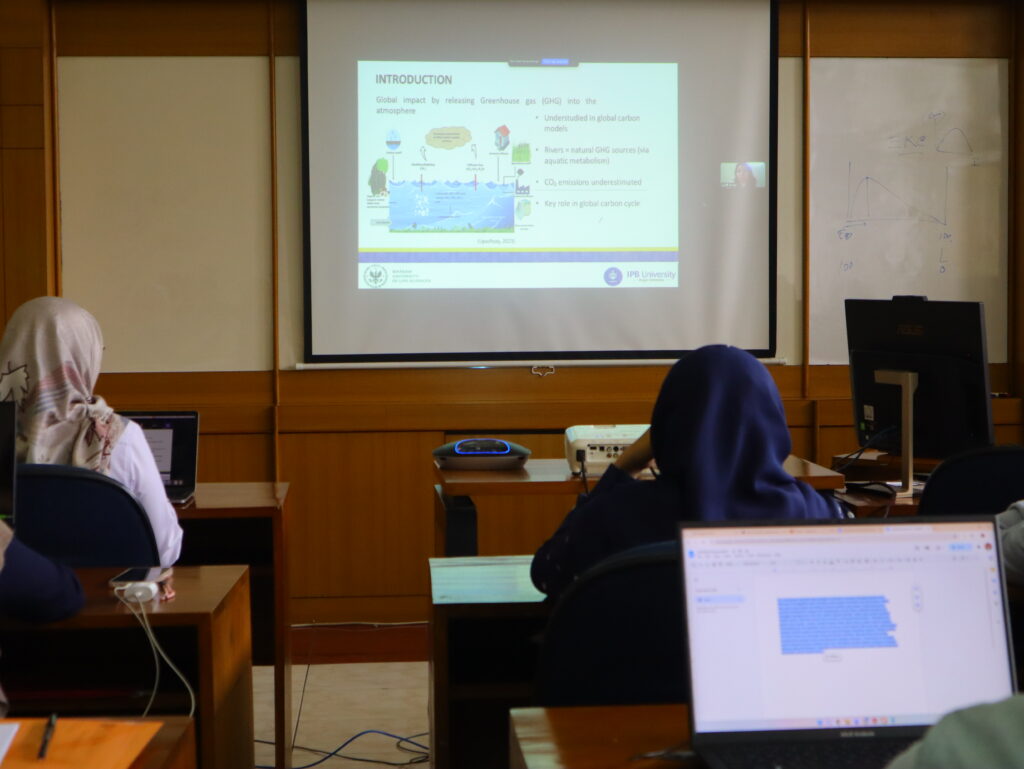 Salah satu topik yang dipaparkan adalah penelitian mengenai kuantifikasi emisi gas rumah kaca (CO₂ dan CH₄) dari sungai dataran rendah dan ekosistem floodplain (Assessing emissions of greenhouse gases from lowland rivers and floodplains as a criterion for river management and restoration). Topik ini merupakan bagian penelitian Sdri. Jessica. Penelitian ini bertujuan untuk memahami kontribusi sungai dan lahan banjir terhadap siklus karbon global yang selama ini masih kurang terwakili dalam model karbon global.  Studi ini diharapkan dapat mendukung kebijakan berbasis bukti dalam pengelolaan lingkungan, konservasi keanekaragaman hayati, serta peningkatan kualitas air.