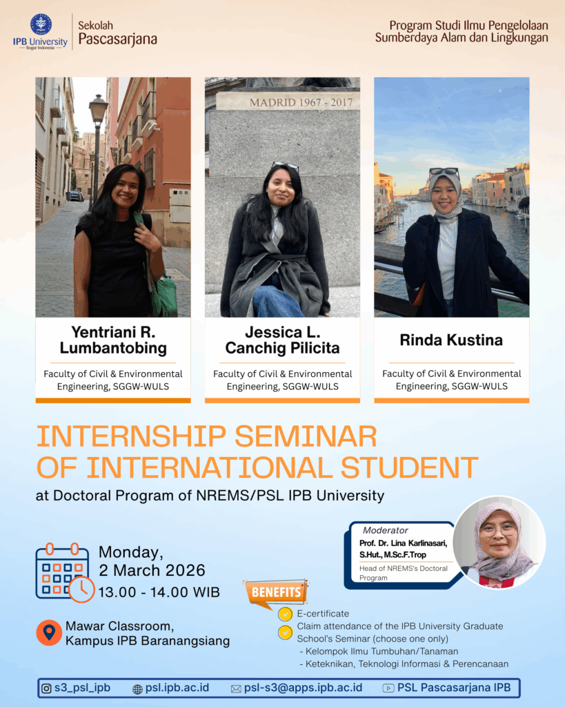 Program Studi Doktor Ilmu Pengelolaan Sumberdaya Alam dan Lingkungan IPB University menyelenggarakan kegiatan Internship Seminar of International Student pada Senin, 2 Maret 2026 siang. Kegiatan ini berlangsung di Ruang Mawar, Kampus IPB Baranangsiang.