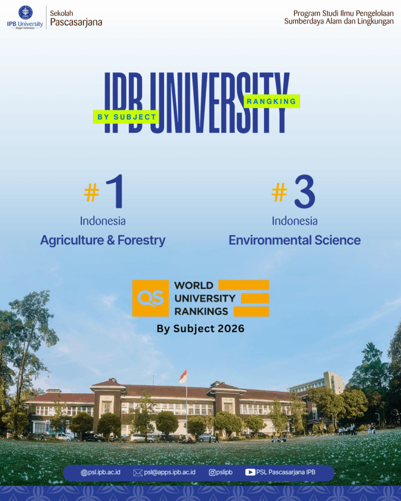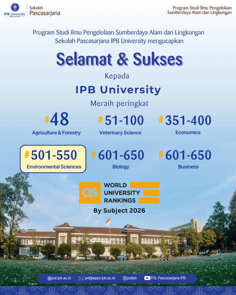 Program Studi Ilmu Pengelolaan Sumberdaya Alam dan Lingkungan, Sekolah Pascasarjana IPB University, menyampaikan selamat dan apresiasi kepada IPB University atas capaian membanggakan pada QS World University Rankings by Subject 2026. QS World University Rangkings adalah