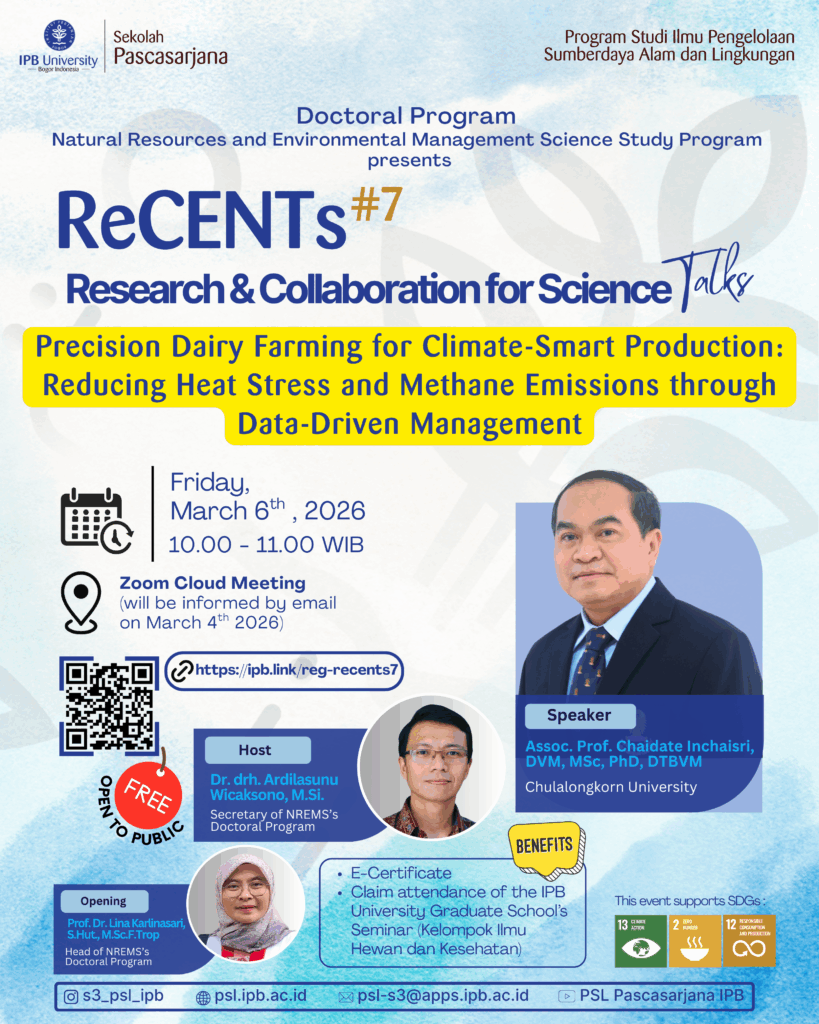 Program Studi Doktor Ilmu Pengelolaan Sumberdaya Alam dan Lingkungan (PSL) kembali menyelenggarakan seri ketujuh dari Research and Collaboration for Science Talks (ReCENTs#7) pada Jumat, 6 Maret 2026. Tema yang diangkat adalah Precision Dairy Farming for Climate-Smart Production: Reducing Heat Stress and Methane Emissions through Data-Driven Management. Kegiatan ini merupakan ruang berbagi pengetahuan pemanfaatan teknologi peternakan presisi untuk mendukung sistem produksi ternak perah yang adaptif, efisien, dan berkelanjutan.