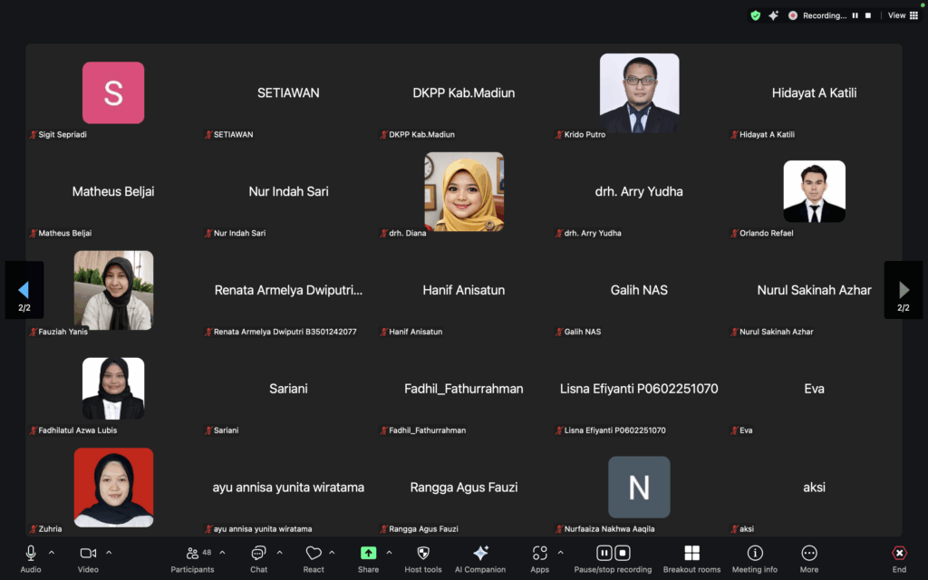 Webinar menghadirkan Assoc. Prof. Dr. Chaidate Inchaisri sebagai narasumber. Beliau merupakan Associate Professor pada Faculty of Veterinary Science, Chulalongkorn University, Thailand. Bertindak sebagai moderator ialah Sekretaris Program Studi Doktor PSL, Dr.drh. Ardilasunu Wicaksono. Adapun Ketua Program Studi Doktor PSL, Prof. Dr. Lina Karlinasari membuka kegiatan ini. Jumlah peserta yang hadir sebanyak 50 orang peserta.