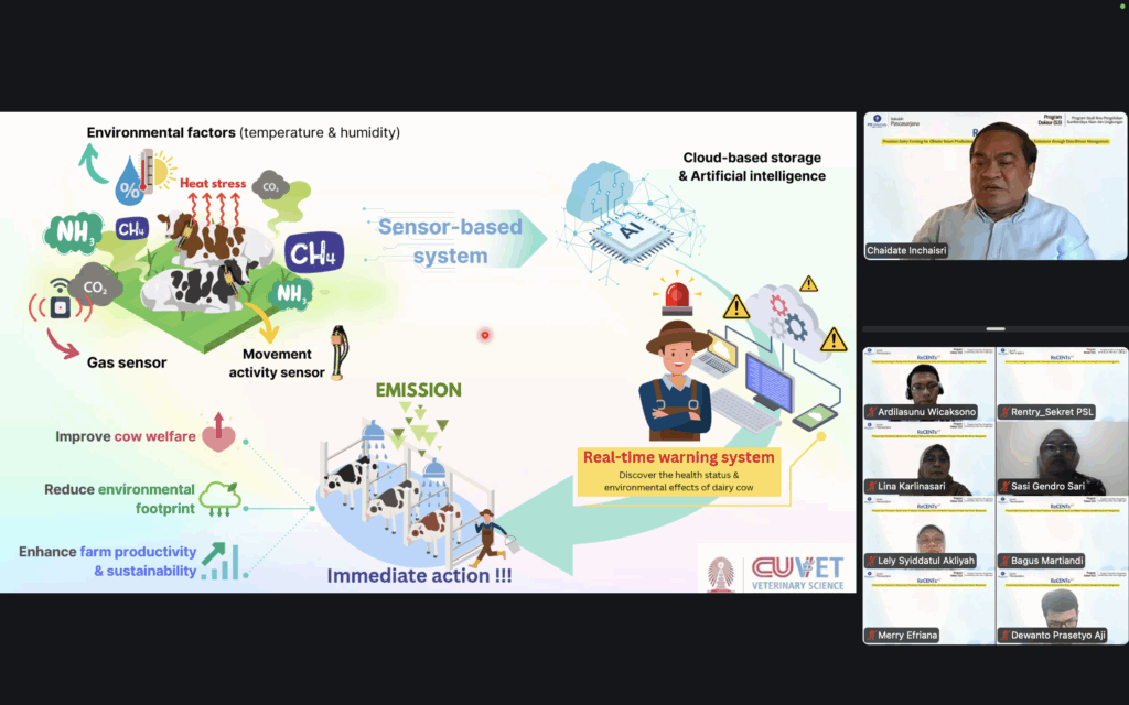 Prof. Chaidate menjelaskan bahwa tantangan utama produksi ternak perah saat ini tidak hanya terkait produktivitas, tetapi juga dampak perubahan iklim. Heat stress dan peningkatan emisi gas rumah kaca, khususnya metana, menjadi isu penting yang perlu ditangani melalui pendekatan manajemen berbasis data dan teknologi pemantauan yang terintegrasi. Lebih lanjut, dijelaskan penerapan sistem berbasis sensor untuk memantau aktivitas ternak, kondisi lingkungan, dan emisi secara real time. Teknologi tersebut mencakup sensor pergerakan, pemantauan suhu dan kelembapan, sensor gas, sistem peringatan dini, penyimpanan data berbasis cloud, serta pemanfaatan kecerdasan artifisial. Teknologi dikembangkan untuk mengetahui status kesehatan ternak dan dampak lingkungan secara lebih cepat dan akurat. Pendekatan ini diharapkan dapat mendukung pengambilan tindakan segera dalam pengelolaan ternak perah.