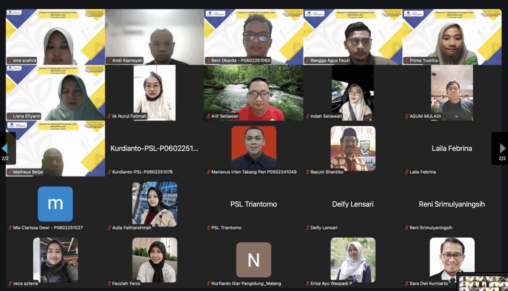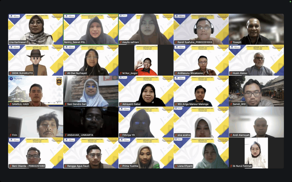 Jumat, 31 Oktober 2025- Program Studi Doktor Ilmu Pengelolaan Sumberdaya Alam dan Lingkungan (PSL) kembali menyelenggarakan Research and Collaboration for Science Talks yang kedua (ReCENTs#2). Pertemuan yang dilakukan secara daring ini diisi oleh dua narasumber dan dihadiri sekitar 45 peserta. Kedua narasumber tersebut mewakili dua lembaga yang berbeda yaitu LRI Lingkungan dan Perubahan Iklim serta LRI Pembangunan Sosial, Ekonomi dan Kawasan. Narasumber tersebut ialah Prof. Dr. Husin Alatas, S.Si., M.Si. Sekretaris Pusat Kajian Sains Keberlanjutan dan Transdisiplin (LRI-CTSS) dan Dr. Ati Dwi Nurhayati, S.Hut., M.Si. sekretaris Pusat Studi Bencana (LRI-PSB). Adapun Kepala Program Studi Doktor PSL, Prof. Dr. Lina Karlinasari, S.Hut., M.Sc.F.Trop bertindak sebagai moderator. Kegiatan ini mendukung SDG 13 (Penanganan Perubahan Iklim/ Climate Action) dan SDG 15 (Ekosistem Daratan/ Life on land)