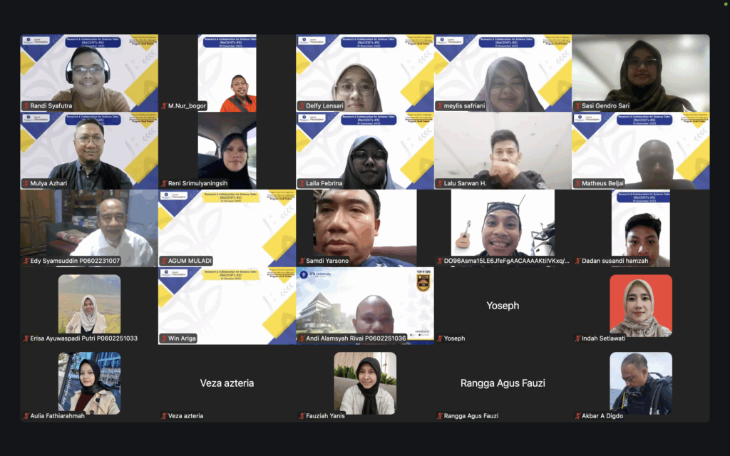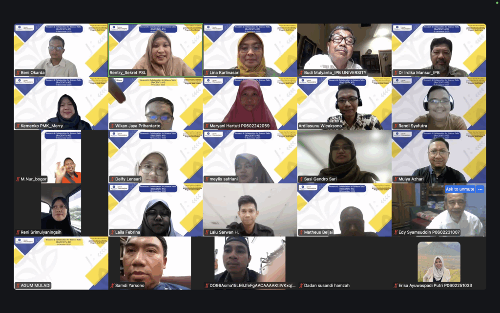 Pada 19 Desember 2025, Program Studi Doktor Ilmu Pengelolaan Sumberdaya Alam dan Lingkungan (PSL) menyelenggarakan episode kelima Research and Collaboration for Science Talks (ReCENTs #5). Dua narasumber yang dihadirkan berasal dari Lembaga Riset Internasional IPB University. Sekretaris Program Studi Doktor PSL, Dr.drh. Ardilasunu Wicaksono turut hadir sebagai moderator. Adapun Ketua Program Studi Doktor PSL, Prof. Dr. Lina Karlinasari membuka kegiatan ini. Kegiatan ini dilaksanakan secara daring dengan 48 orang partisipan.