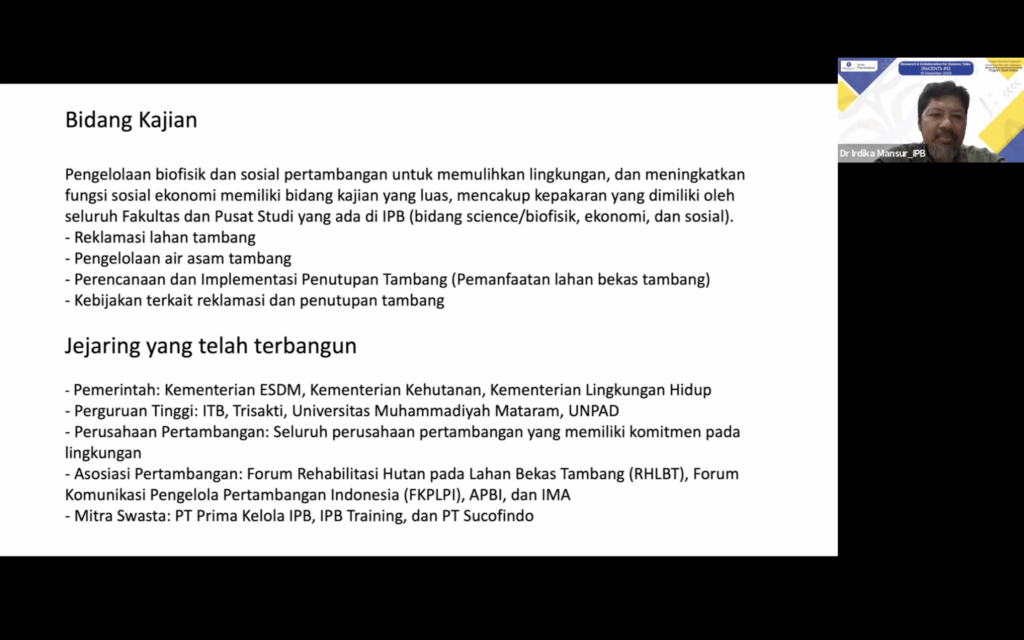 Pada kesempatan ini, Dr Irdika juga menjelaskan proses penambangan yang baik dan contoh sukses reklamasi lahan bekas tambang. Melalui Reklatam, IPB berkontribusi dalam mencari solusi tentangan reklamasi tambang sekaligus meningkatkan fungsi dan nilai guna lahan. Kegiatan ReCENTs #5 ini mendukung pencapaian Tujuan Pembangunan Berkelanjutan / SDGs yaitu poin 9 (Industri, Inovasi, dan Infrastruktur), poin 12 (konsumsi dan produksi yang bertanggung jawab), poin 13 (penanganan perubahan iklim) dan poin 15 (ekosistem daratan).