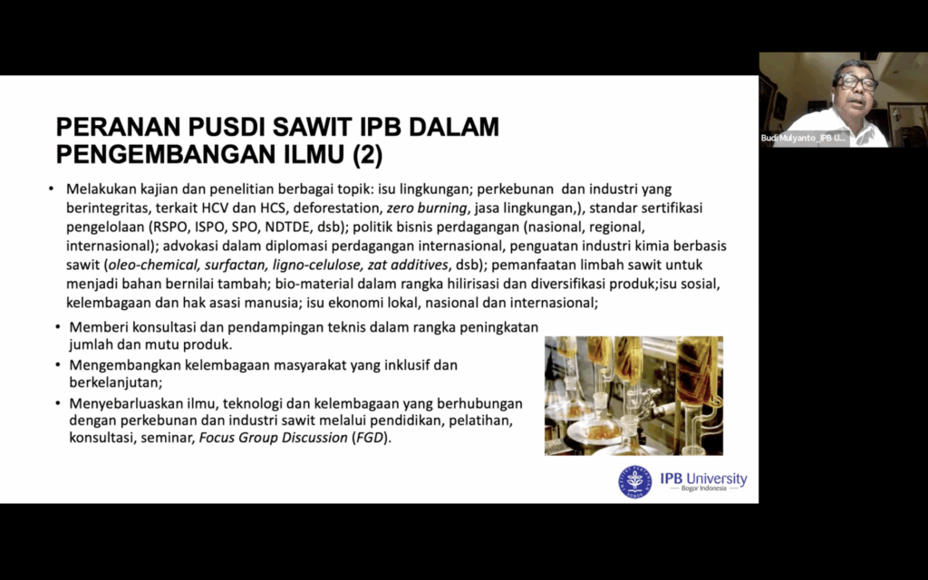 Sama halnya dengan Reklatam, Pusdi Sawit menyelenggarakan penelitian sebagai salah satu kegiatannya. Melalui pemaparannya, Prof Budi membahas tantangan dan pentingnya budidaya kelapa sawit serta menyoroti dampak ekonomi dan sosial terhadap masyarakat. Beliau menekankan perlunya penelitian berkelanjutan untuk mengatasi masalah yang berkaitan dengan keanekaragaman hayati dan konservasi lingkungan.