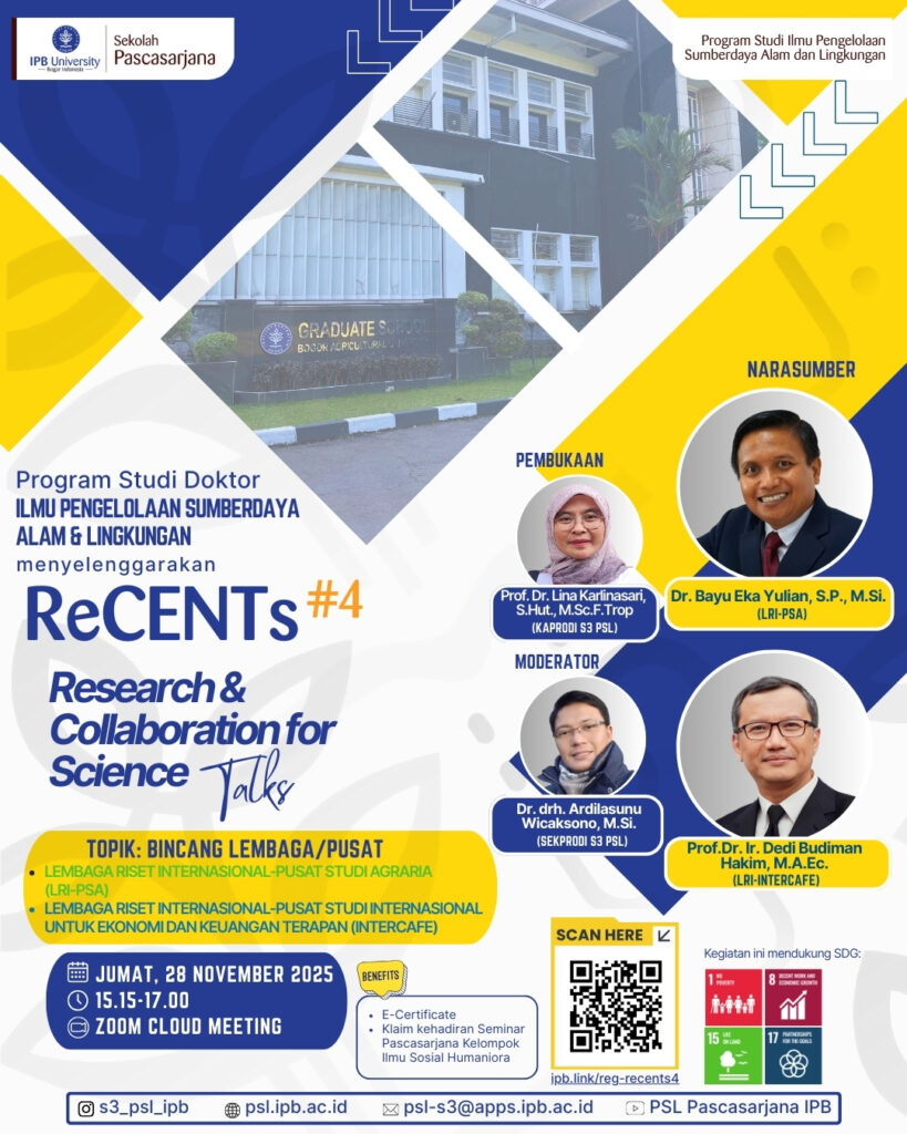 Program Studi Doktor Ilmu Pengelolaan Sumberdaya Alam dan Lingkungan menyelenggarakan ReCENTs #4 yang akan dilaksanakan pada: