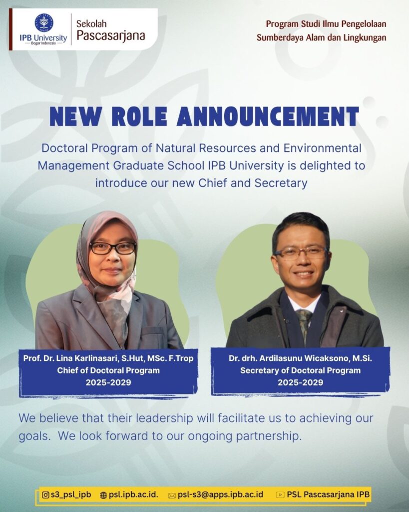 Pada 16 Oktober 2025 telah terpilih Dr. drh. Ardilasunu Wicaksono, M.Si. sebagai Sekretaris Program Studi Doktor Ilmu Pengelolaan Sumberdaya Alam dan Lingkungan (PSL) IPB University untuk periode 2025-2029. Sebelumnya, Prof. Dr. Lina Karlinasari, S.Hut, MSc. F.Trop dipilih sebagai Ketua Program Studi Doktor Ilmu Pengelolaan Sumberdaya Alam dan Lingkungan IPB University untuk periode 2025-2029. Terpilihnya kedua pimpinan tersebut diharapkan dapat membawa PSL terutama program studi doktor semakin maju, inovatif dan terus berkontribusi nyata bagi keberlanjutan pengelolaan sumber daya alam lingkungan. Selamat mengembang amanah baru dan semoga sukses.