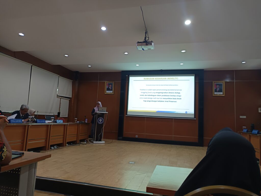 Sidang Promosi Doktor Program Studi Ilmu Pengelolaan Sumberdaya Alam dan Lingkungan (PSL) Sekolah Pascasarjana IPB University dilaksanakan pada 23 Desember 2025. Bertempat di Kampus IPB Dramaga Bogor, Novriyanti berhasil mempertahankan disertasinya di hadapan dewan penguji. Tim Komisi Pembimbing terdiri dari Prof. Dr. Ir. Damayanti Buchori, M.Sc (Ketua), Prof. Dr. Ir. Burhanuddin Masy’ud, M.S (anggota) dan Dr. Ir. Rinekso Soekmadi, M.Sc.F.Trop (anggota). Sidang turut menghadirkan penguji luar Prof. Dr. Satyawan Pudyatmoko, S.Hut., M.Agr.Sc (Kementerian Kehutanan) dan Prof. Dr. Ir. Dodik Ridho Nurrochmat, M.Sc.F.Trop (IPB University).