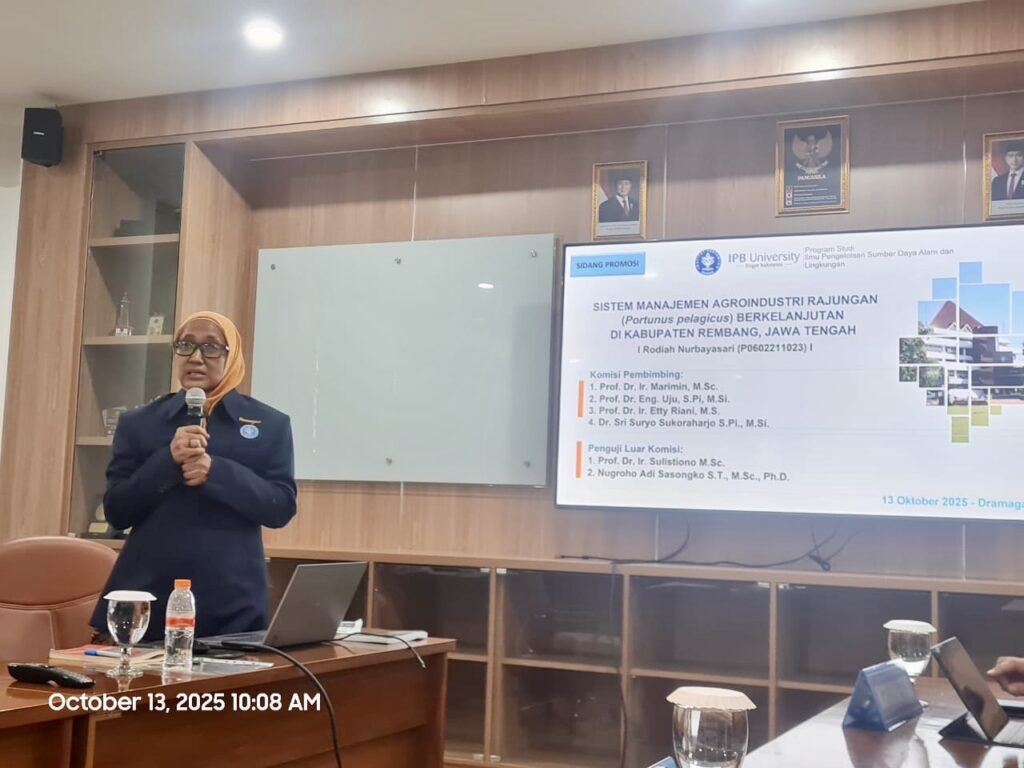Program Studi Doktor Ilmu Pengelolaan Sumberdaya Alam dan Lingkungan (PSL) Sekolah Pascasarjana IPB University, kembali melahirkan doktor baru. Rodiah Nurbayasari, mahasiswa Program Doktor PSL angkatan 2021, berhasil mempertahankan disertasinya di hadapan dewan penguji. Sidang Promosi ini digelar pada hari Senin, 13 Oktober 2025 di ruang 301, Kampus IPB Dramaga, Bogor. Tim Komisi Pembimbing yang hadir terdiri atas Prof. Dr. Ir. Marimin, M.Sc. selaku ketua serta Prof. Dr. Eng. Uju, S.Pi., M.Si., Prof. Dr. Ir. Etty Riani, M.S., dan Dr. Sri Suryo Sukoraharjo, S.Pi., M.Si. selaku anggota. Adapun Penguji luar pada ujian terbuka yaitu Prof. Dr. Ir. Sulistiono, M.Sc. (IPB University) dan Nugroho Adi Sasongko, S.T., M.Sc., Ph.D. (BRIN). Penguji luar pada ujian tertutup adalah kedua nama yang sama.